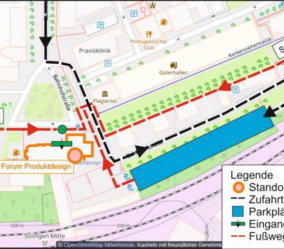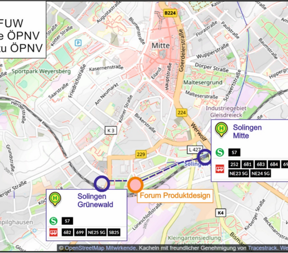 1) Nehmen Sie die Linie S7 bis Solingen Grünewald. Von der Haltestelle Grünewald sind es nur 3 Gehminuten bis zum Forum Produktdesign.