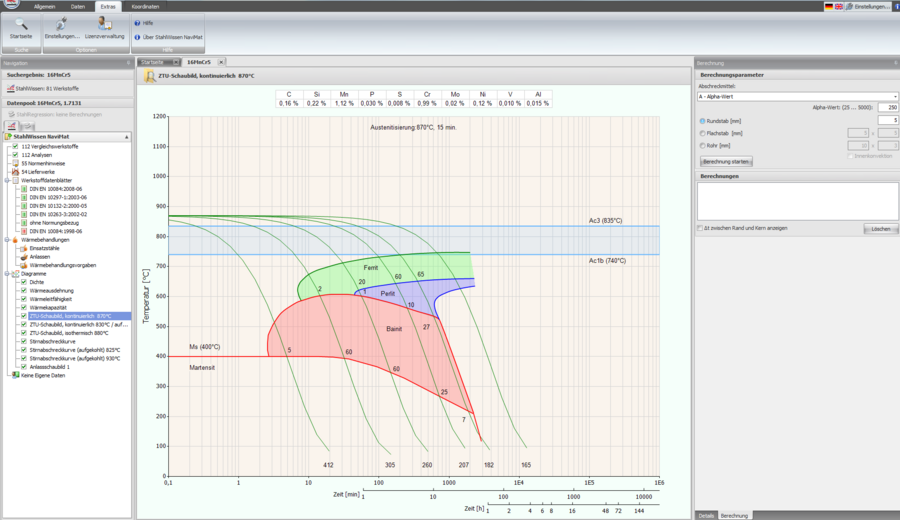 Mit Hilfe des Programms StahlRegression, das als Modul in StahlWissen® NaviMat integriert ist, können u.a. ZTU-Schaubilder und Festigkeitswerte von individuellen Analysen, Abmessungen und Wärmebehandlungen simuliert werden.