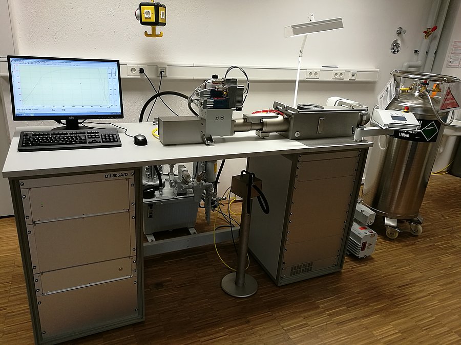 Das Dilatometer DIL805 der Fa. TA Instruments dient zur Untersuchung von materialspezifischen Phasen- bzw. Gefügeumwandlungen während einer definierten Wärmebehandlung. Dabei wird eine Voll- oder Hohlprobe unter Luft, Inertgas oder Vakuum induktiv erwärmt und anschließend mit definierter Abkühlgeschwindigkeit kontinuierlich abgekühlt. Aus der gemessenen Längenänderung lassen sich Beginn und Ende von Phasenumwandlungen sowie der thermische Ausdehnungskoeffizient des Materials bestimmen. Dabei ist es auch möglich, Phasenumwandlungen während oder nach einer Umformung mit definierten Umformparametern (z.B. Umformgrad φ, Umformrate) zu ermitteln. Zudem können Proben konstant oder zyklisch auf Zug/Druck belastet werden, so dass auch die Untersuchung von Kriech-/Relaxationsvorgängen sowie die Bestimmung der Dauerfestigkeit des Materials bei erhöhter Temperatur möglich ist. Somit können bspw. Schmiede- oder Walzvorgänge und das Ermüdungsverhalten von Werkstoffen bei erhöhter Temperatur praxisnah simuliert werden.
