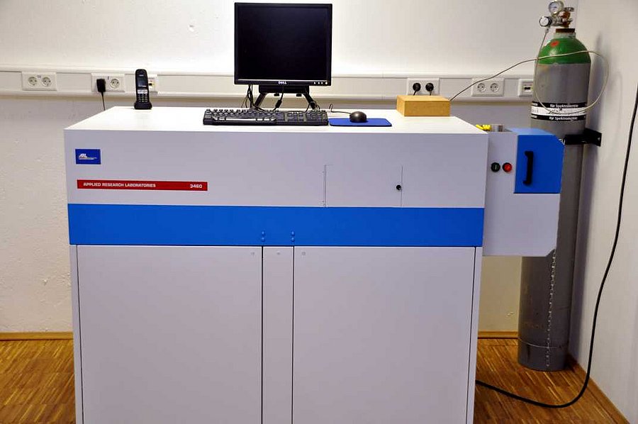 Das optische Emissionsspektrometer ARL 3460B wird zur Bestimmung der chemischen Zusammensetzung von eisenbasierten Legierungen eingesetzt. Es arbeitet hierbei mit Hilfe eines elektrischen Funkens, der Material aus der Oberfläche der Probe verdampft. Das so ermittelte Emissionsspektrum wird anschließend in einzelne Spektren, die elementspezifisch sind, zerlegt und ausgewertet. Im Gegensatz zu Verfahren wie der energiedispersiven Röntgenanalyse oder der Röntgenfluoreszenzanalyse können hierbei auch leichte Elemente wie Kohlenstoff sicher gemessen werden.