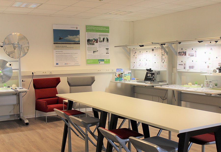 Anschaulich wird im WiLa an Projekttischen gezeigt, was beispielsweise Spielplätze sicherer macht und wie bei der Fertigung von Industriemessern Material nachhaltiger zum Einsatz kommen kann.